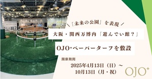 年齢や性別を問わないあらゆる人が楽しめる場所を作る際に、機能性と環境負荷低減の両立があるOJO⁺ペーパーターフで... 広場の一角には紙製人工芝が敷かれた、ふかふかエリアが作られました...大阪・関西万博での施行事例